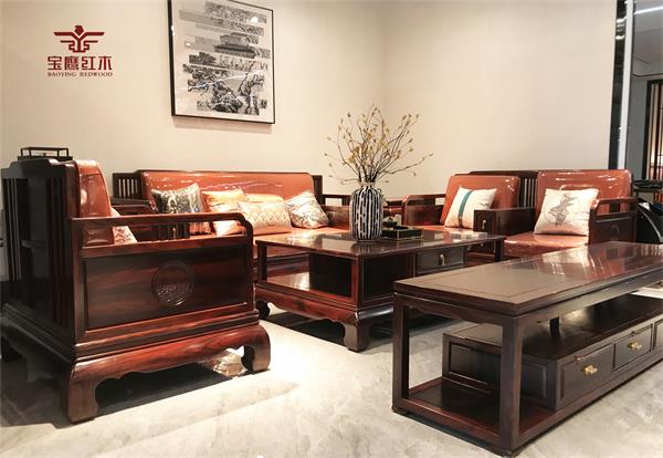 结构之韵:雅致风华,诗意栖居家宝红木黑酸枝家具,在造型设计上尽显高雅与端庄。精巧的纹饰与质朴的形貌相得益彰,直线与圆弧的几何线条交织,共同编织出一幅雅致而诗意的视觉画卷,营造出一种超脱尘嚣的氛围。每一件家具的命名与元素背